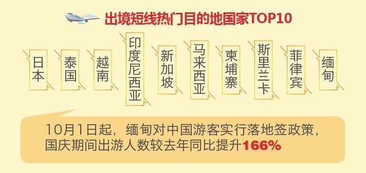 出境短线方向,今年“十一”人气最高的目的地国家前十名分别为日本、泰国、越南、印度尼西亚、新加坡、马来西亚、柬埔寨、斯里兰卡、菲律宾、缅甸。与往年相比,日本、泰国等地依旧热度不减,东南亚由于签证、航班等便利因素也吸引了众多游客前往。10月1日起,缅甸对持普通护照短期赴缅旅游的中国公民实行落地签政策,其国庆期间的出游人数较去年同比提升了166%,一举进入出境短线热门目的地TOP10榜单。